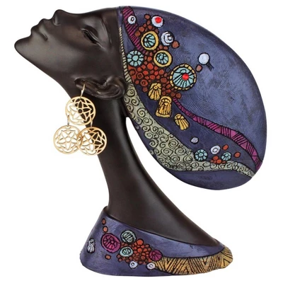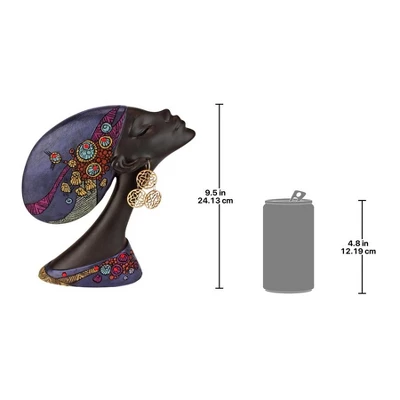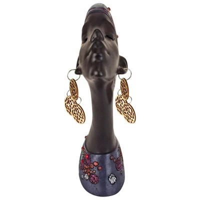 Celebrating African sculpture by heralding the ancient headdress or “gele,” Ghanaian artist Ohene pays homage to the intricate wraps that indicated the power and status of West African queens documented in ancient Nubian statues. Our African statue is cast in quality designer resin, hand-painted in the celebratory palette of Africa and embellished with dimensional earrings and is deeply etched and sparkles with tiny faux jewels. Our Basil Street-exclusive, modern African statue can stand alone as exotic safari decor or take its place amidst your prized safari decorations for home or gallery. 8½”Wx2½”Dx9½”H. 2 lbs.