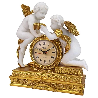 Ornately carved putti flank the French Empire stylings of this lush timepiece, sure to create an elegant statement atop mantel or sideboard. Our sophisticated baby angels are cast in designer resin and finished in faux gilt gold and ivory. The cherubs adorn a contemporary-quality quartz clock that boasts Roman numerals and accepts your two AA batteries. 9½”Wx4″Dx10½”H. 5 lbs.