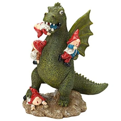 How do you like your gnomes? Our dragon monster likes his flamed broiled! Whether you’re a dragon fan or a gnome lover, you’ll likely get a good, tongue-in-cheek laugh at the plight of these poor garden jesters! With kooky caps and screwball slippers askew, four prized pixies are in the clutches of this medieval muncher. The Gothic beast and four prized pixies are all cast in quality designer resin and hand painted to capture their wild woodland warfare. In home or garden, these Design Toscano exclusive collectible figurines are sure to attract attention! 9″Wx7″Dx12″H. 3 lbs.