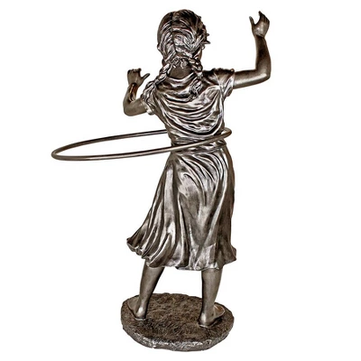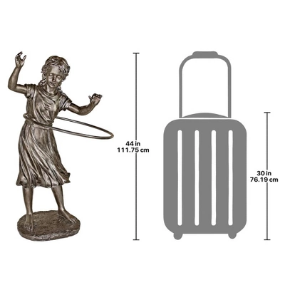 Can you hula hoop? If you long for the days when good, clean fun meant the shoop-shoop sound of the hula hoop sprinkled with childhood laughter, you’ll love Harriet’s antics! Arms stretched high and face intently concentrating, this endearing, almost life-size child sculpture is alive with contemporary drama. This Design Toscano gallery quality work is cast in quality designer resin with a faux bronze finish for proud display as a gallery or garden art collectible. 27″Wx23″Dx44″H. 45 lbs.