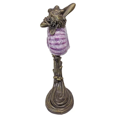 A mesmerizingly mythic mermaid rides the crest of a wave atop a nautilus seashell that shines with the magical glow of the moonlit ocean. Blending art, architecture, and elements of fine design, this faux bronze, quality designer resin lamp is an exquisite 360-degree Basil Street Gallery sculptural work of art. Accented with a stunning, crackled glass mosaic shade that shines with your 25-watt, Type “B”bulb, this illuminated sculpt is controlled by a switch on cord. Simple assembly required. 14½” Wx9″ Dx 29″ H. 20 lbs.