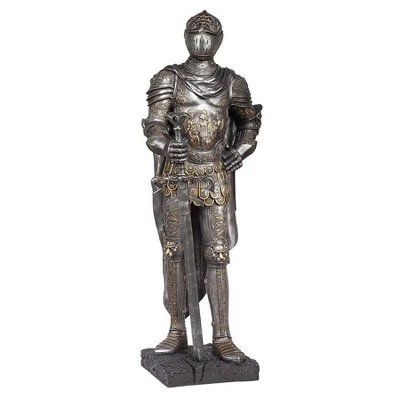 At more than a yard tall, this incredibly detailed, museum replica knight is a true statement piece! Whether standing guard alone or paired to flank an entrance, our 26 lb. quality designer resin museum replica is clad in 16th-century style Italian armor, proudly displaying his sword and a chestplate emblazoned with intricately sculpted lions. Features a two-tone metallic finish.