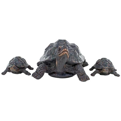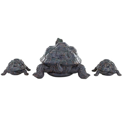 Is it time to come out of your garden decor shell? Add this group of turtle statues, called a “bale,” beneath a tree, near a fountain, pool, or pond, or even in an aquatic themed bath. These tortoises are realistically sculpted with leathery reptile skin and protective armor turtle shells. Each Design Toscano exclusive animal statue is cast in quality designer resin and individually hand painted as telltale tortoise collectibles for your water garden pond. One mama animal statue and two baby outdoor ornaments make this trio a statement piece that brings wildlife into your natural world. Mother: 8″Wx9.5;”Dx4″H. 2 lbs. Babies: Each 4″Wx4.5;”Dx2″H. .5; lb.